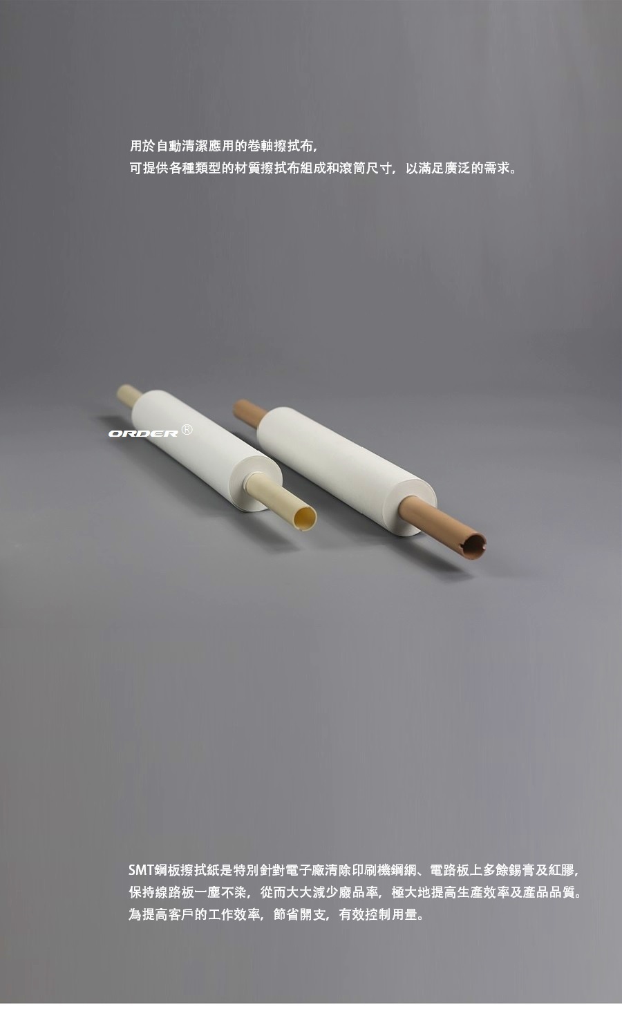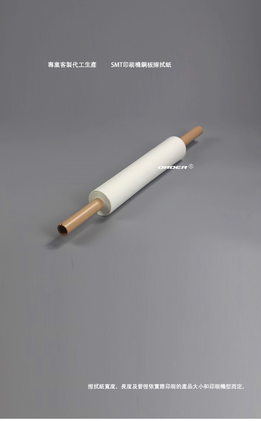 SMT擦拭卷紙由無塵紙和內管(紙管、膠管)構成,內管長度、內徑、外徑,無塵紙料寬度、長度(可依客戶要求定制)。