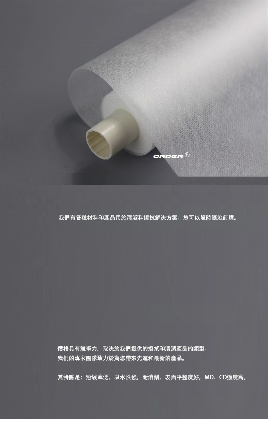 2、有20年以上製造、銷售工業、電子產業專用擦拭紙/布產品的豐富經驗; 專業不織布材料的應用,並庫存眾多的不同材料,以滿足不同客戶對不織布材料的需求選擇