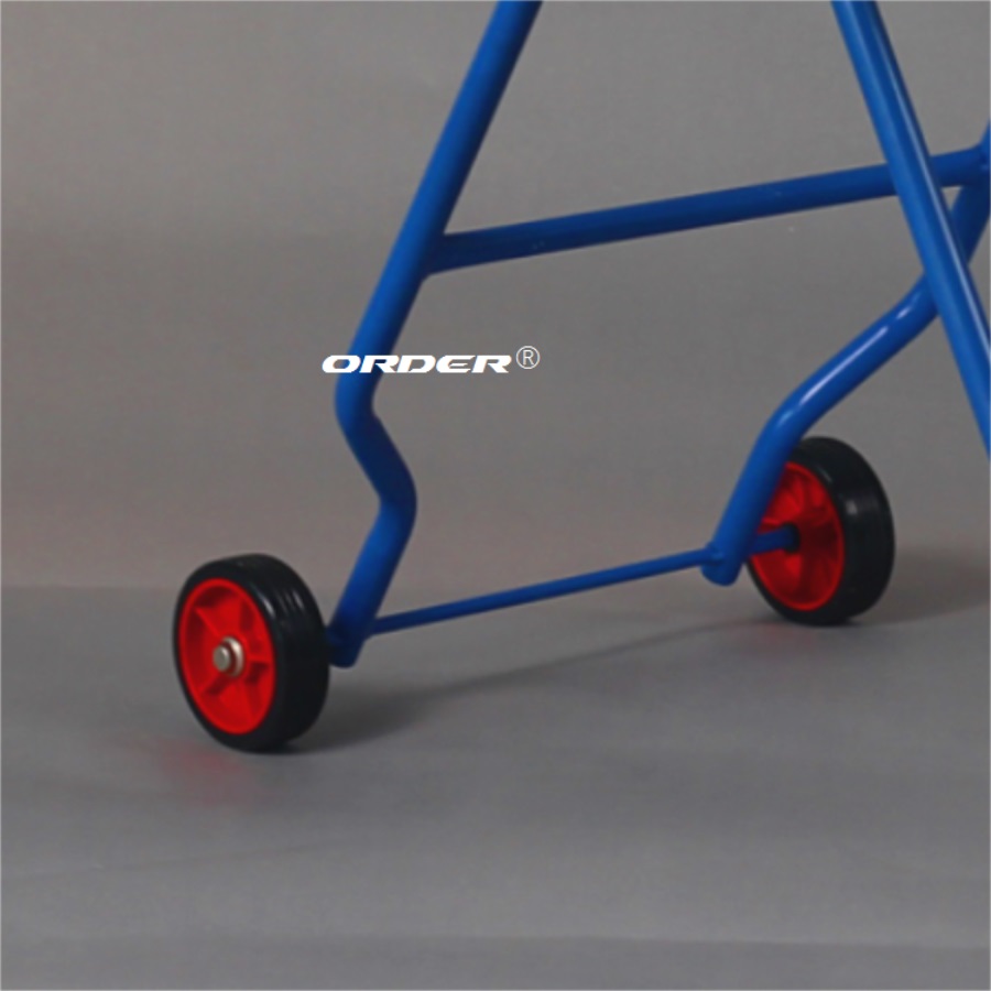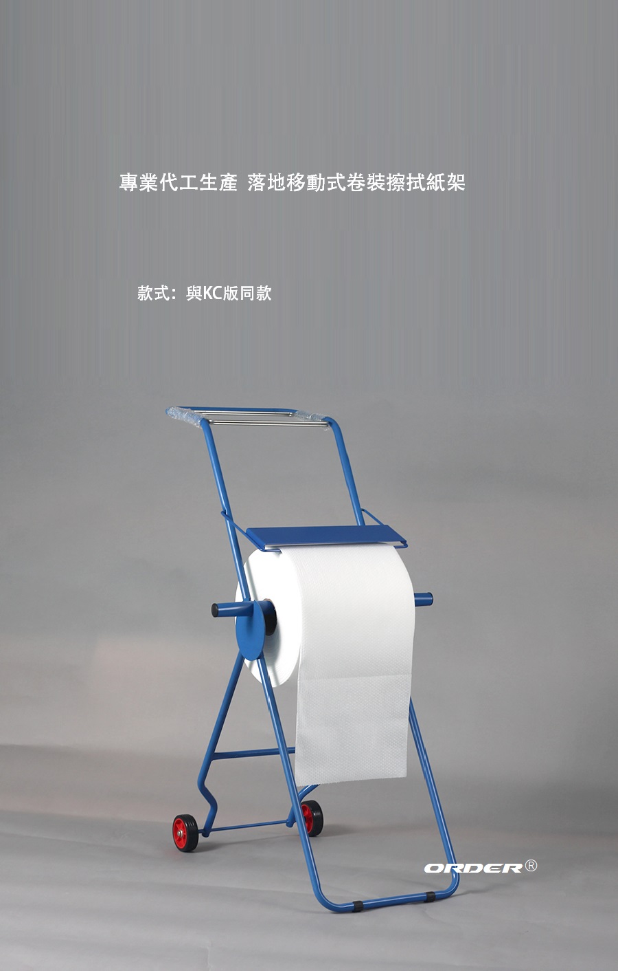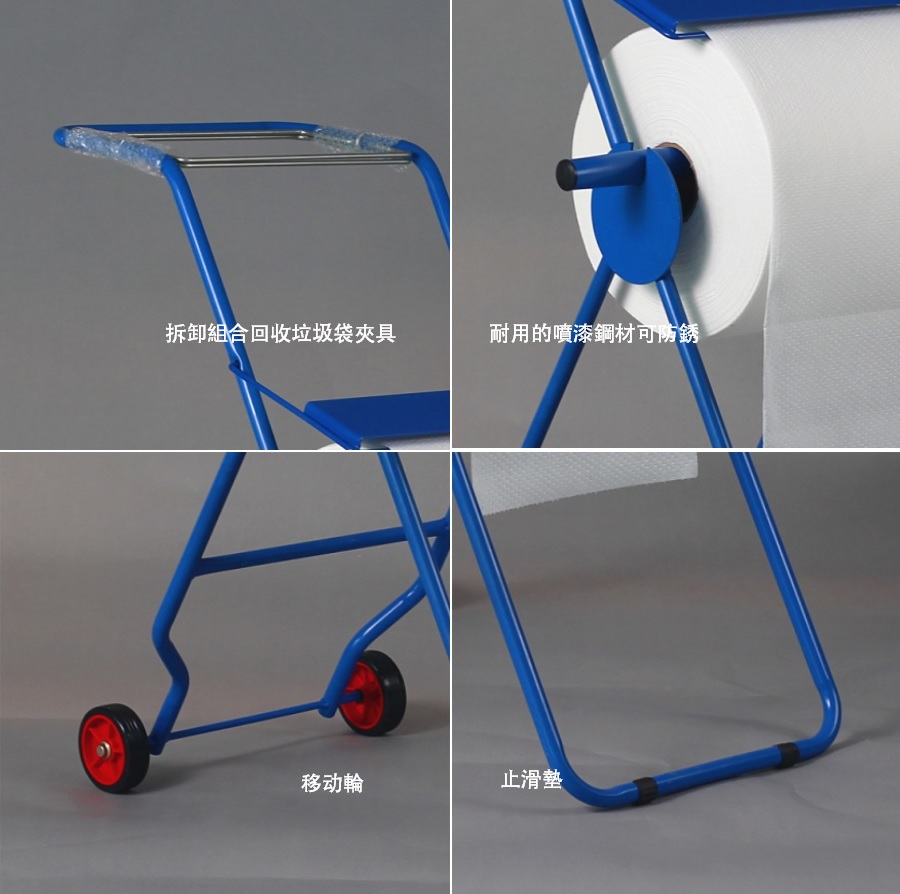移動式落地支架; 藍色烤漆金屬材質。 適用於大卷裝紙安放使用。