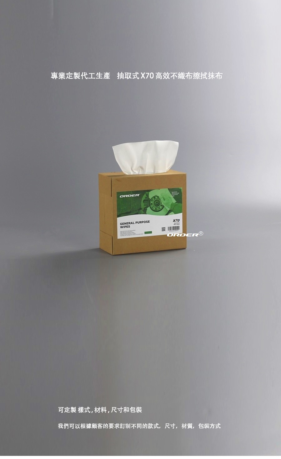 由高科技不織布材料成,可迅速吸收油污; 可適用於油污、水及各種溶劑的擦拭;