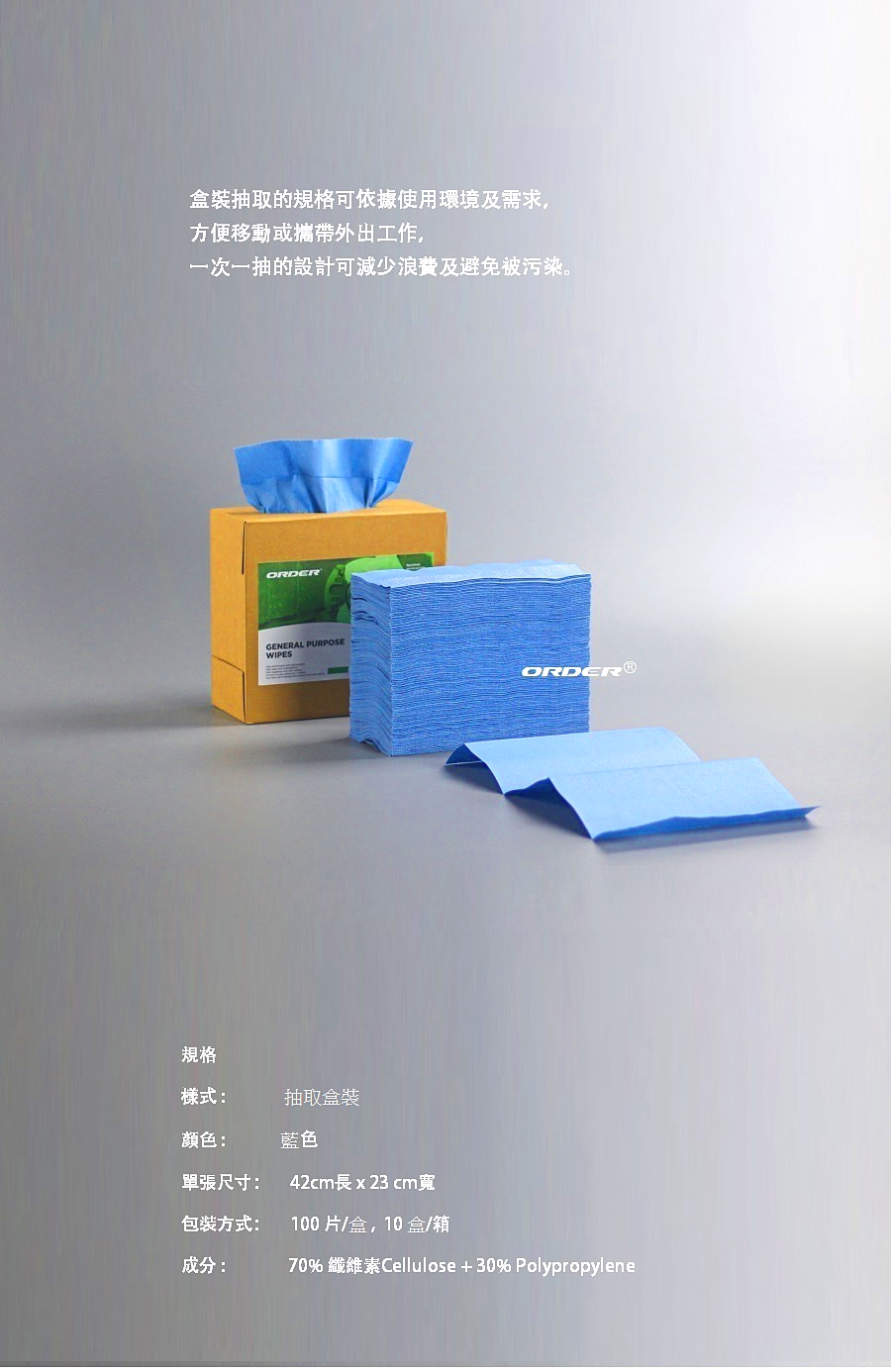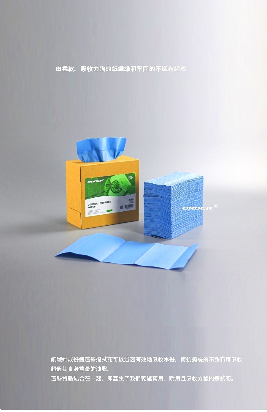 由高科技不織布材料成,可迅速吸收油污; 可適用於油污、水及各種溶劑的擦拭;