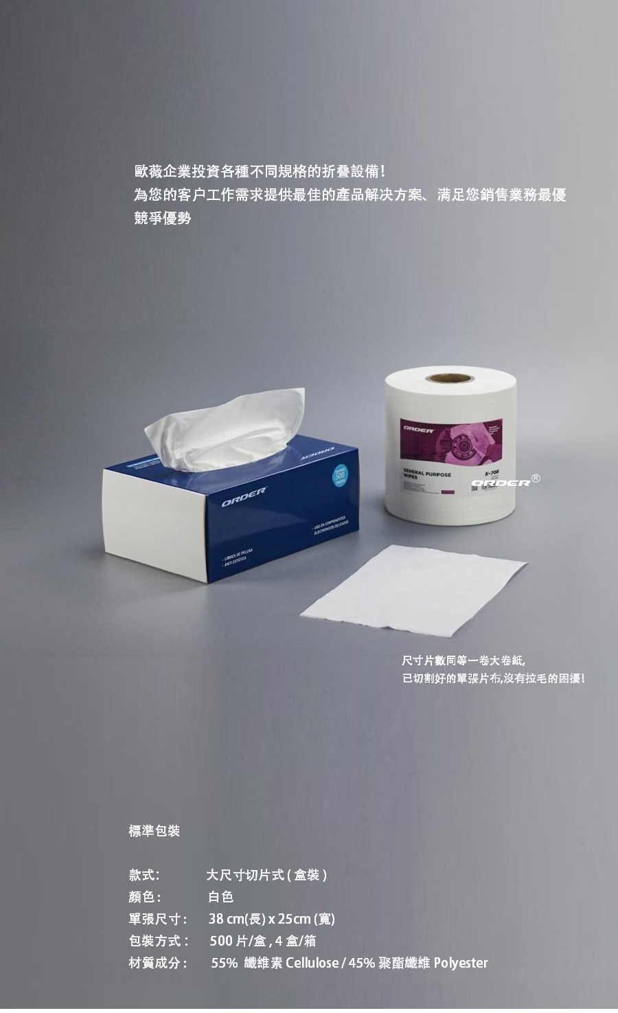 * 擦拭布非常適合特殊的準備任務,在這些任務中,低絨毛和最少使用化學品很重要; 印刷、噴漆前應用、玻璃和電器製造、發動機組裝/維修的理想選擇