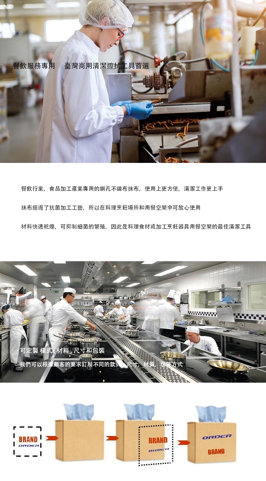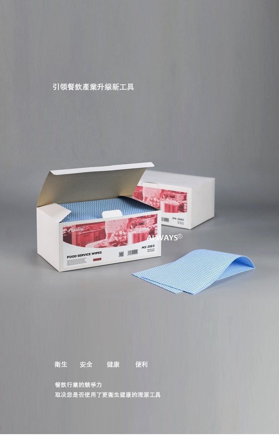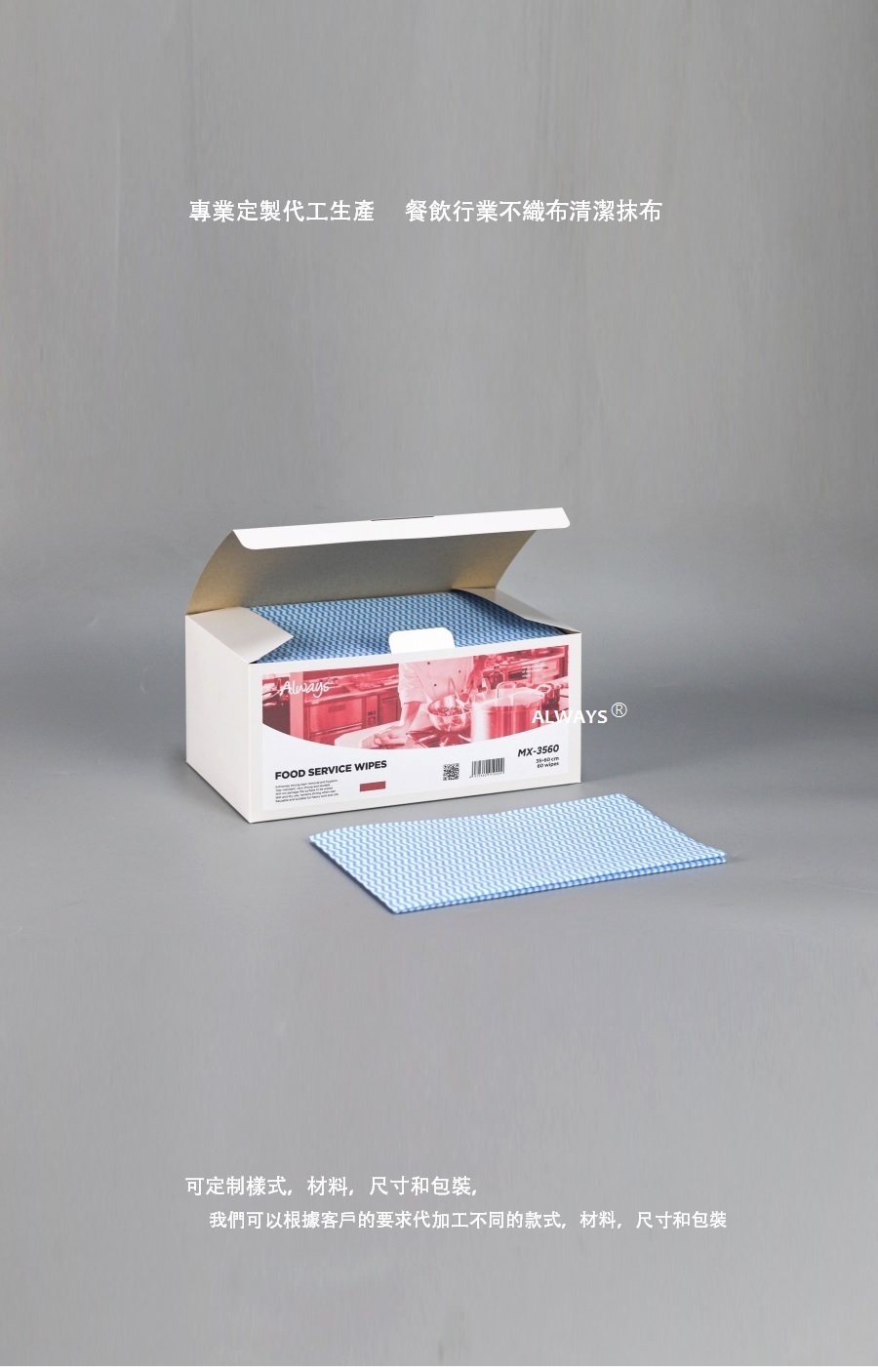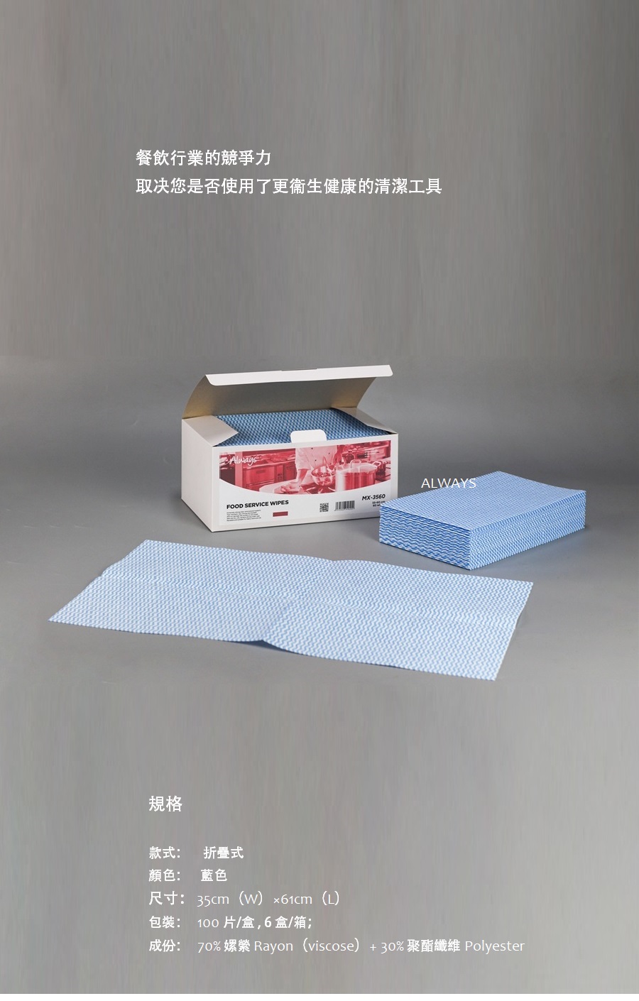 ALWAYS*彩色清潔擦拭布採用特殊的不織布製成,能够迅速吸收液體和塵粒,吸收性强而且結實耐用。 對於食品行業有著較佳的適用性,讓客戶可以自行選擇後進行分色管理,確保不同區域使用對應顏色的擦拭布,减少互動感染。